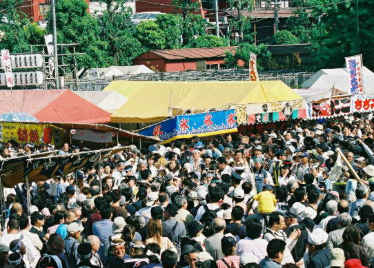 次は浅草寺本堂前。ここでもとりあえず正面の位置をっと思い2〜3段階段を上ったあたりで待機。けっこう好位置での撮影に成功!!ここまでは良かった!!ここからが・・・連合おおとり なのに、本堂前と宝蔵門の間は見物人でいっぱい! | ||