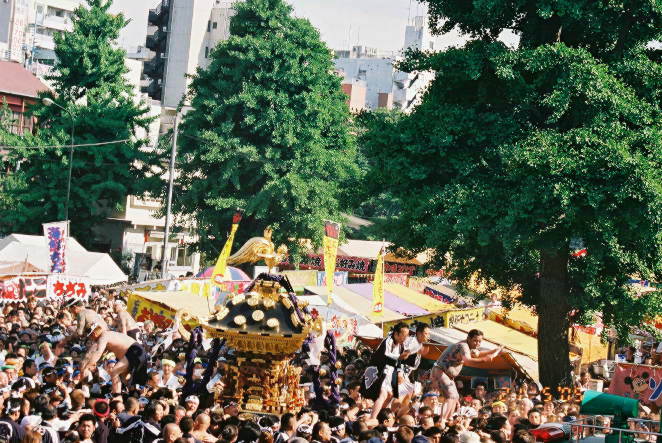 そして一番大ラスに浅草寺裏に到着!砂ぼこりを起こしながら待機地へ。 いや〜今日はあっつい!!熱気も伴っているのでめちゃ暑い! 三北神輿は浅草寺裏に到着するとウワッと人が寄ってくる感じがします。 |