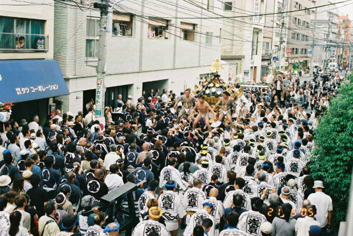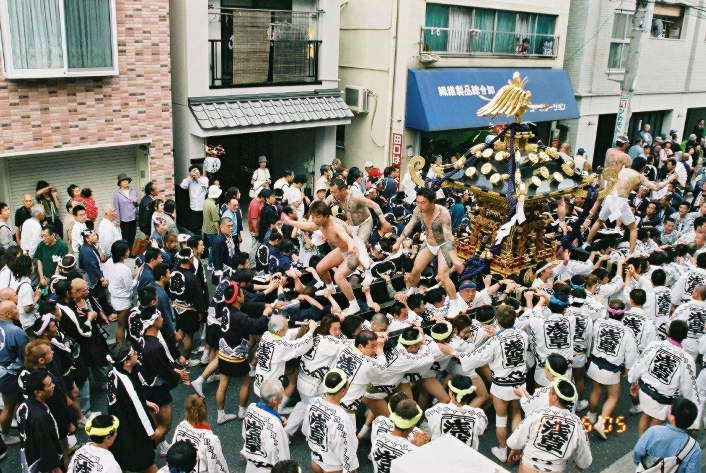 しばし休息の後、神輿近くで連合の出発待機。。。なんかね、満員電車の中みたいな密集状態でしたよ。ちょっと酸欠ぎみだったし。 お隣が出発して、今年の連合渡御のおおとり、西浅三北神輿の発進の声がかかり、マニアな大勢のギャラリーの元、三北神輿が再び砂ぼこりを舞い上がらせて、発進するのでした。 私め、チョロチョロ隊の動きも激しくなります。 |