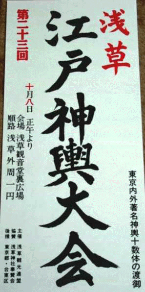 お知らせで〜す! 運猫が『鳥越祭を愉しむ会』でもお世話になった御輿同好会「江戸 祭華會」のお御輿が来る平成13年10月8日(月・祝日)の「江戸御輿大会」に参加します!<これはすごいっ!! 昨年は諸事情により行われなかった「江戸御輿大会」ですが、今年はお御輿11体が浅草を渡御します。三社祭とは雰囲気が全然違いますが、時間と興味のある方は浅草へ行ってみて下さいませ。←なぜ私がPR?(笑) そして「祭華會」のお御輿&渡御もしっかり見てきて下さいね〜!←またまたPR!(笑) 以上、運猫のお祭り情報局(あったのか?・爆)からでした〜(^o^)/ |