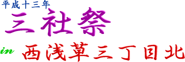 | 今年もやってきました、三社祭!そしておなじみ?三北町会。 いつも以上に人が多かったかも・・・ここのページは西浅三北町会の渡御の様子をご紹介します。 今年は担ぎ棒を新調したそうです。 とりあえず、私も担ぐことが出来ました。ご感想はご意見ページからどうぞ。 |