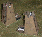 | One of my mobile siege towers. They are scratch-built, mostly from card and matchsticks. The crew at the top are on a separate base so they can be replaced by other figures if I want to use them for another army. One of the figures is from Peter Pig (the mostly hidden guy, on the other tower to the right he is the same figure is the guy with the green tunic ), the other two are both Gladiator. | I really want a guy at the back scaling the ladder - but the figure conversion will be quite tricky, so this is something for the future... Some of the crews really ought to be archers, since crossbowmen were by no means the only missile weapon employed at the time in Italy. Just a matter of getting hold of (and painting) the right figures. |