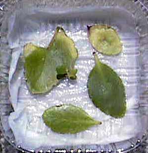 プラスチックの容器にティッシュペーパを敷き、水を入れ、葉っぱをその上に。