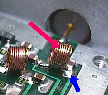 photo 3: 赤い矢印で示したコイル2つとコンデンサ2つを取り除く