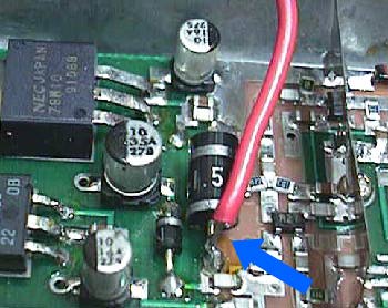 この改造は、アンテナコネクタから電源を供給しない場合の改造です。この改造を行なう場合は、必ずMOD 2の改造を行なって下さい。そうしないと電源がRIGのアンテナ端子に流れ込んでしまいます。