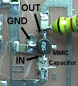 - Put a MMIC between the capacitors and soler it. Be sure the MMIC direction. Ground pin is solered to the left capacitor. The point is just Ground. An another side of MMIC ground pin remains open.