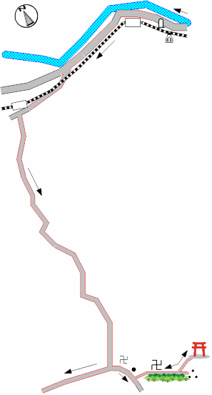 宿坊街を抜けると、出羽三山神社の大きな石の鳥居が建っている。その少し先に、随神門という大きな山門がある。ここから羽黒山頂の出羽三山神社まで、約1.7Kmの参道が続いている。門を入ると、いきなり下りの長い石段がある。継子(ままこ)坂といい、一気に谷底まで降りてしまう。下りきったところに赤い神橋があり、右手に須賀の滝がある。橋下を流れるのは祓川で、行者はここで身を清めた後、霊域の山上と俗世の山麓を分ける神橋を渡った。