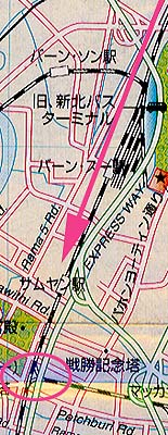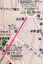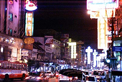 更に南下するとセブンイレブン。水(900ml 5B)だけ購入。 続いて通行量の多い交差点(駅からの西方面の大きな道と交差する)を越え、 次の大きい交差点...右手(西側)に電飾の派手な灯りがアカアカと ともる東西の通りが、有名なヤワラー通りである。 |