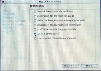 :図3の「言語を選択」で、この後のインストール・設定アシスタント・MacOS Xで使用する言語を選択する。 初期は英語になっているが、「主に日本語を使用する」のラジオボタンにチェックすると日本語に切り替わる。図3で「続ける」をクリックすると、「ようこそ」「大切な情報」「使用許諾契約」という順で確認画面が出てくるのでインストールを続ける場合は、「続ける」ボタンをクリックする。