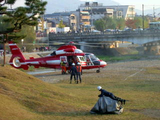 電車でまた出町柳駅へ帰ってきて、下鴨神 社へ行こうと思っていたら・・・こんなことに 出会った! 鴨川で人を誘導してヘリの到着場所を消防 が確保して20分が過ぎる頃・・・ヘリが到 着! プロペラを止めずに人が乗り込む・・・、そし てまた20分ごヘリは帰ってくると・・・。 何があったのだろう?何か、ケースを持っ た人が乗り込んで行ったよ・・・? |