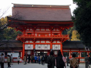 下鴨神社の大きな参道と言う名の森を抜け ると・・・神社の正面の門が見えてきます。 |