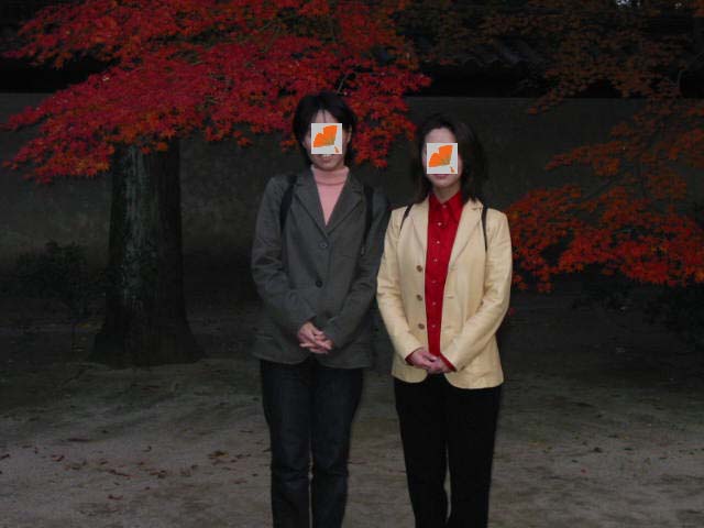 神社の紅葉はこの時はちょっと早かったよ うです、が、きれいな紅葉を見つけたので パチリ! 管理人(右)とお友達で・・・。 |