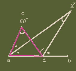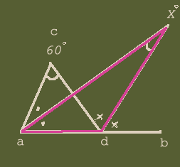 (図2)三角形adxで見ると、∠axd+∠xad=∠xdb つまり、 ∠X°+(∠・)=(∠×)