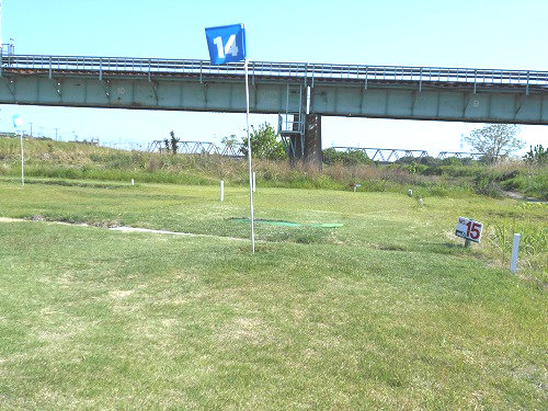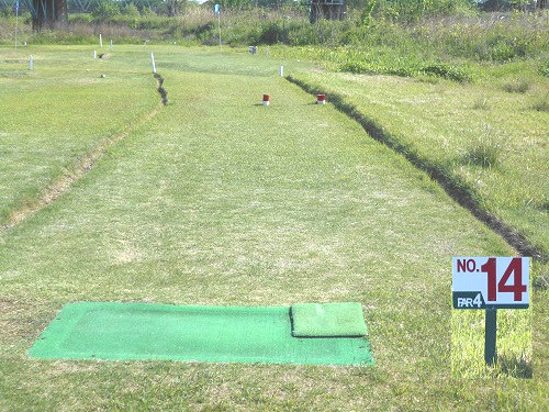 関門を抜けることが大事。 強めに打つと、関門を通っても右のOBに落ちやすい。 関門の先に止まるように第1打を打つ。