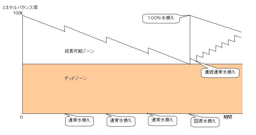 まずミネラルバランス率を100%に一旦してから、回復水換えが長期飼育のコツです。