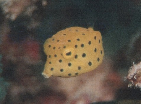 すみません、ちょっとボケてますが、こちらはおなじみ、少しハデめのミナミハコフグヤングです。