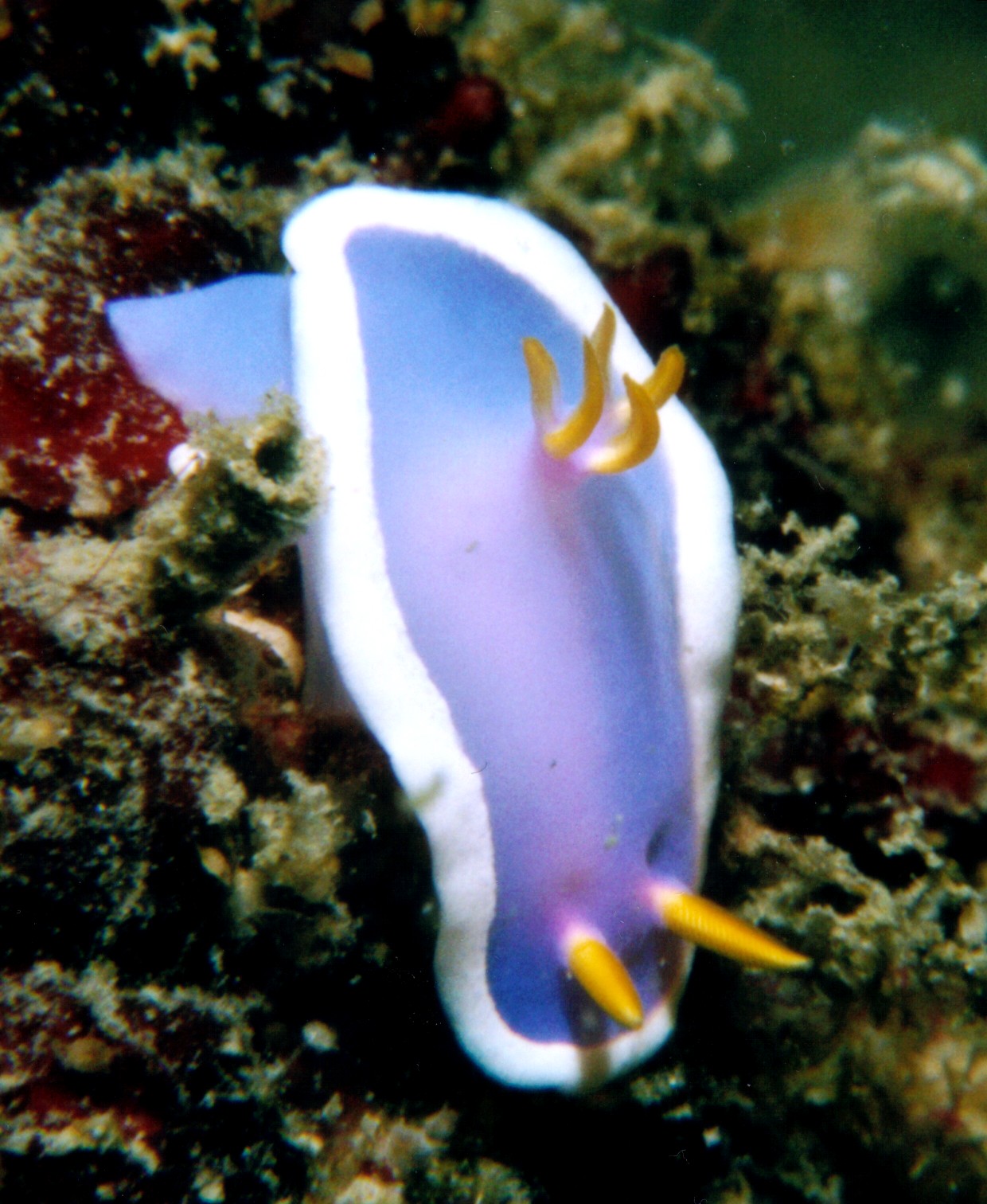 体長3cmほどの個体。以前“カグヤヒメウミウシ”と呼ばれていたタイプです。しかし、多くは体地色がピンクのもので、