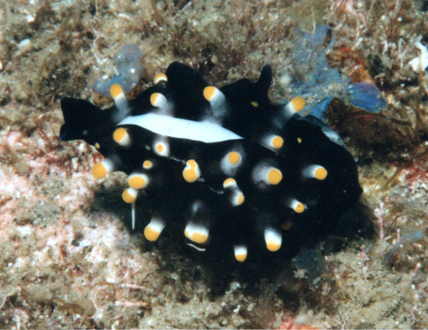 体長3cmほどの個体。岩の上のトサカ類の中にいたのを秋太郎さんが見つけました。黒い外套幕に先が黄色い突起で 鮮やかな配色です。貝の図鑑などは、ほとんどが貝殻の状態のものしか写真が無く、このように殻が見えない状態だと名前 の探しようがありません。でも、これだけ印象的な貝なのですから、ダイバーの中には知っている人もいると思います。 いずれ名前が判ったら訂正します。 2002. 10. 27. 「双子瀬」ポイントにて としていましたが、ウミウシを見るために購入した“Coral Reef Animals of the Indo-Pacific”という本を見ていたら載ってま した。この先端が黄色い突起についてこの本によると、「Phyllidia madangensis(和名マダングイボウミウシ)」に擬態していて、 成長してこのウミウシよりも大きくなると、成体のウミウサギのような外套幕になるそうです。しかし、周りにいるものに擬態して こそ意味のあるというもの、日本にはほとんど例の無いマダングイボウミウシに擬態して意味があるのでしょうか。まあ、生物の 不思議さは十分感じられる話ですが。 2002. 12. 10. 更新 |