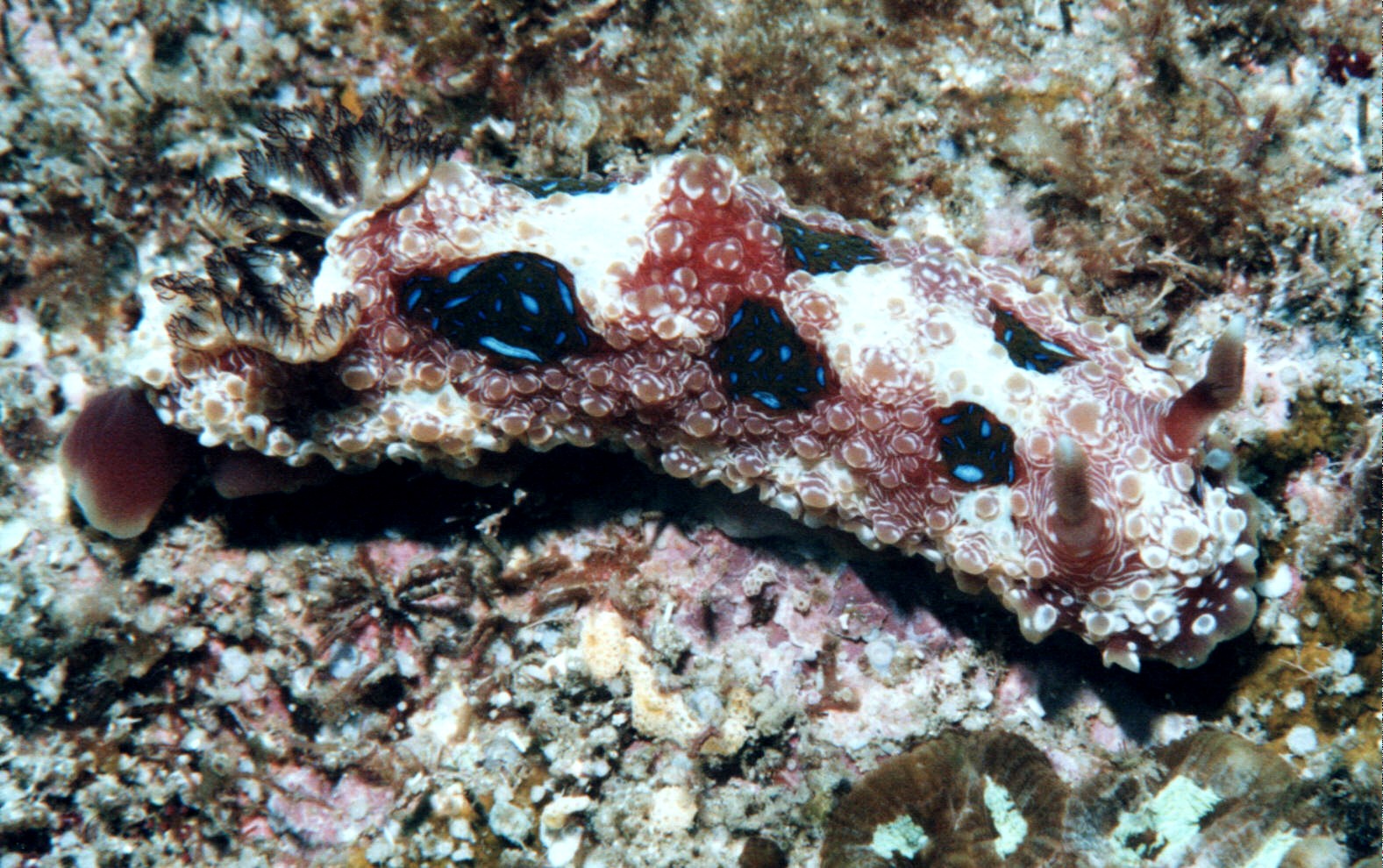 体長7センチほどの個体。平らな岩の上を移動中でした。よく見るミヤコウミウシとは若干雰囲気が違うので、ネットなどで調べましたが、 100%該当するものはありませんでした。しかし、触角や二次鰓、イボ状突起とブルーのスポットの組み合わせなど、ミヤコウミウシの特徴 は兼ね備えています。ただ、体全体に占めるイボ状突起の割合が異常に多いのが気になります。ブルーのスポットのある範囲も、左右に 3対ずつきれいに並んでいるのもどうかと思ったんですが、これは、『西海』のところに載せているミヤコウミウシが、多少そのような感じにも 見えるのでありかな、と思ってます。結論として、今のところ完全に一致するものが見つからず、ミヤコウミウシの特徴を持っていることから、 ミヤコウミウシとしておきますが、今後、新たな事実が見つかれば再同定するかもしれません。 2002. 7. 13. 「99」ポイントにて |