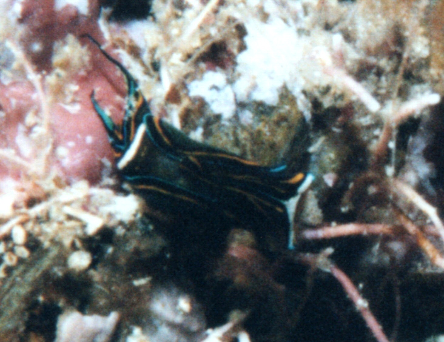 体長5mmほどの個体です。実際見た時は、頭部と体後方の白いライン以外は真っ黒に見えたので、オハグロツバメガイか アカボシツバメガイではないかと思ったのですが、写真でオレンジとブルーのラインが確認できたので、ニシキツバメガイとしま した。ウミウシガイドブックの写真のものは頭部の白いラインがありませんが、色彩変異も多いと書いてあるし、何よりもオレンジ とブルーのラインが決め手となると思います。クローバーの葉っぱのような海藻の裏にいて、観察する為にひっくり返して見て いたら、石の上に落ちて急いで逃げていきました。小さな固体ということもあり、撮影に苦労しました。 2002. 10. 26. 「松ヶ浦」ポイントにて |
