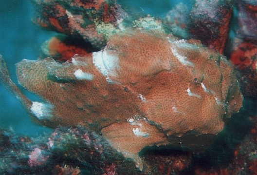 変わったところに鎮座ましましてました。切り立った根の途中の、ウミウチワのようなソフトコーラルの上です。 周りには何もなく、泳ぎの下手なイザリウオでは、とてもほかの場所へ移動できるようなところではありません。 このソフトコーラルを離れた瞬間、まっ逆さまに根を転がり落ちるでしょう。しかし、どうやってここへ来たのか、 それも不思議です。もしかしたら、ここで生まれて、一切動いていないのかもしれません。 まだ、大きくなるような個体ですので、ソフトコーラルが耐えられるかが心配です。 2001.7.22 「二つ張」ポイントにて |