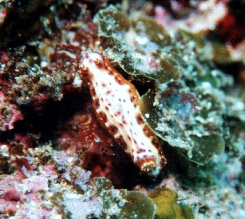 体長2センチほどの個体ですが、今回の中で同定に一番苦労しました。一見フジタウミウシ科の仲間かと思いましたが、 二次鰓が体後方にあることや、別角度からの写真で尾を縮めているのを確認できたので、イロウミウシの仲間であると判り、 体中に白い小さな点があることと触角がリング状に茶色く染まることからあたりをつけ、オーストラリアの研究家ラドマン博士 のサイトで確認したところ、これだと判りました。ウミウシガイドブックに載っている個体は背中の部分がもっと黄色っぽいの ですが、ラドマン博士のサイトに投稿されていたマーシャル諸島からの報告のものにほぼ一致するものがありました。 イロウミウシの仲間は活動的なものが多いのですが、これは全く動かず、そのあたりも最初に迷った要因かもしれませんが、 なかなか楽しませてくれました。 2002. 5. 5. 「大串」ポイントにて |