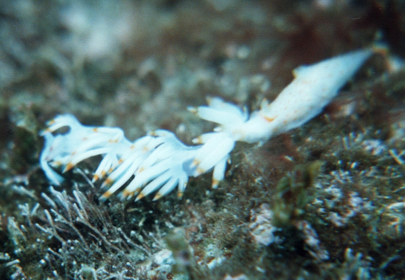 アカボシウミウシがサキシマミノウミウシを捕食している現場です。残圧が50をきったので浮上しかけてふと下を見たときに見つけました。 異様に長いウミウシだなと思って、またもう1度確認に降りてしまいました。これまた良い子のダイバーは真似をしないように。 別のポイントでは、同じくアカボシウミウシが、エビかカニなどの幼体ではないかと思われるものを捕食しているところも見ました。こちらは 角度が悪く写真をアップできません。やはりアカボシウミウシもキヌハダウミウシの仲間だと改めて感じましたが、瀬戸内海で見るキヌハダ ウミウシがクロシタナシウミウシなどに食いついているものほどえげつなく感じないのは、食いついてる方も食いつかれている方もそれなりに きれいだからでしょうか。 2002. 5.19. 「千尋の西(北)」ポイントにて |