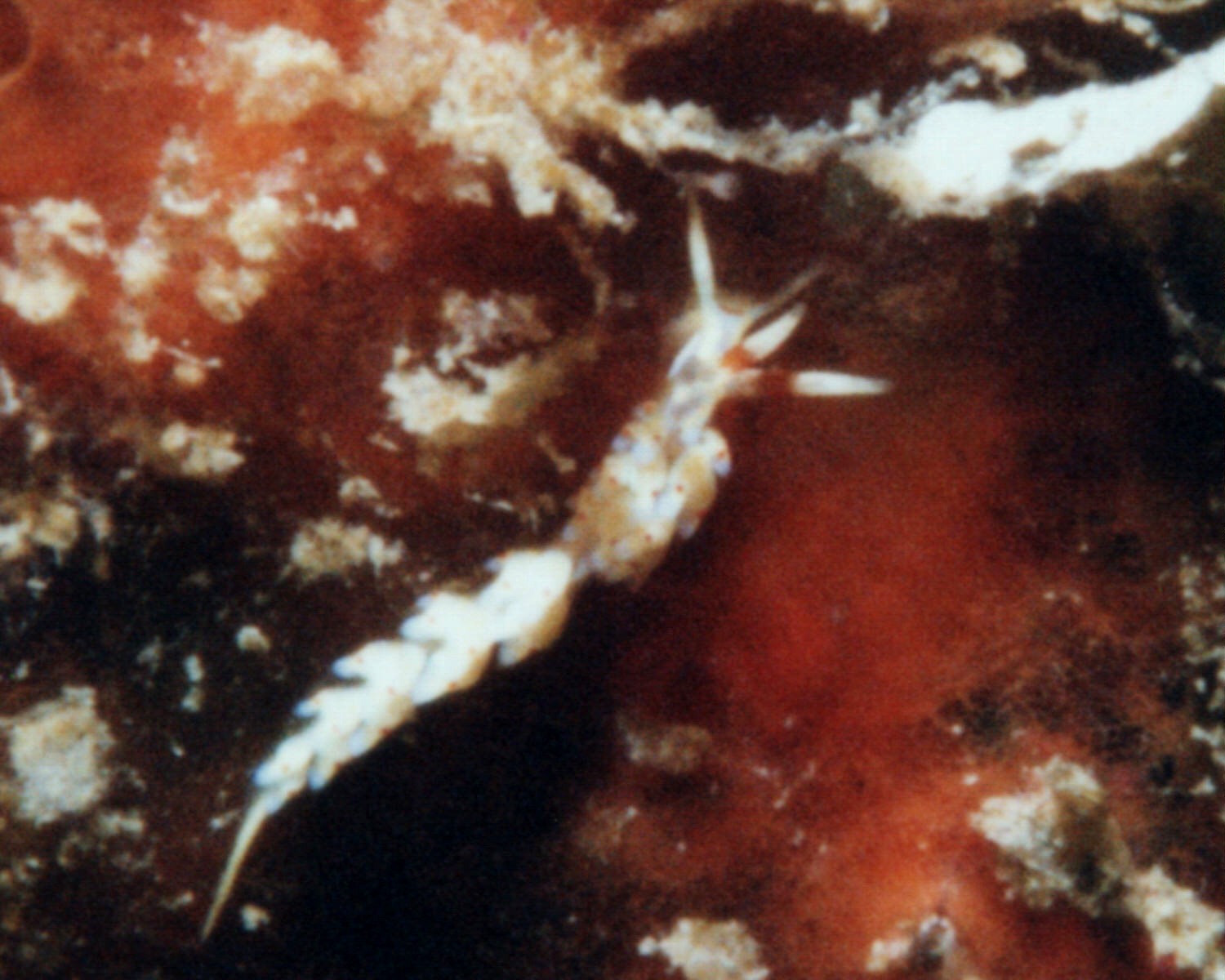 体長1cmほどの個体です。このように小さく、まして細長い体形の被写体はなかなかピントが合わせ辛く、岩の壁にいたことで
