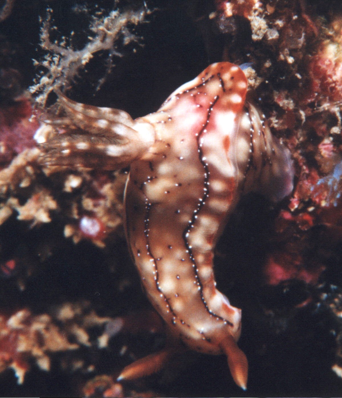 体長3cmほどの個体。ここでよく見るH.krakatoaとは、体の渕の模様の色や二時鰓の色彩パターンが違います。実際見た時も センテンイロウミウシかとも思ったのですが、触角の模様が違うし背中のライン上に白い点が散在するのが確認できて、これだろう と思ってました。写真を見ながらネットでいろいろ調べた結果、ラドマン博士のサイトにマレーシアやパプアニューギニアからの報告 のものに同じ色パターンのものがありました。従来の青紫の色合いのものは、日本や台湾などでよく見られ、このような茶色っぽい ものはインドネシアーマレーシア型だそうです。さすがに黒潮洗う三崎浦だけのことはあります。 2002. 12. 23. 「ロックガーデン」ポイントにて |