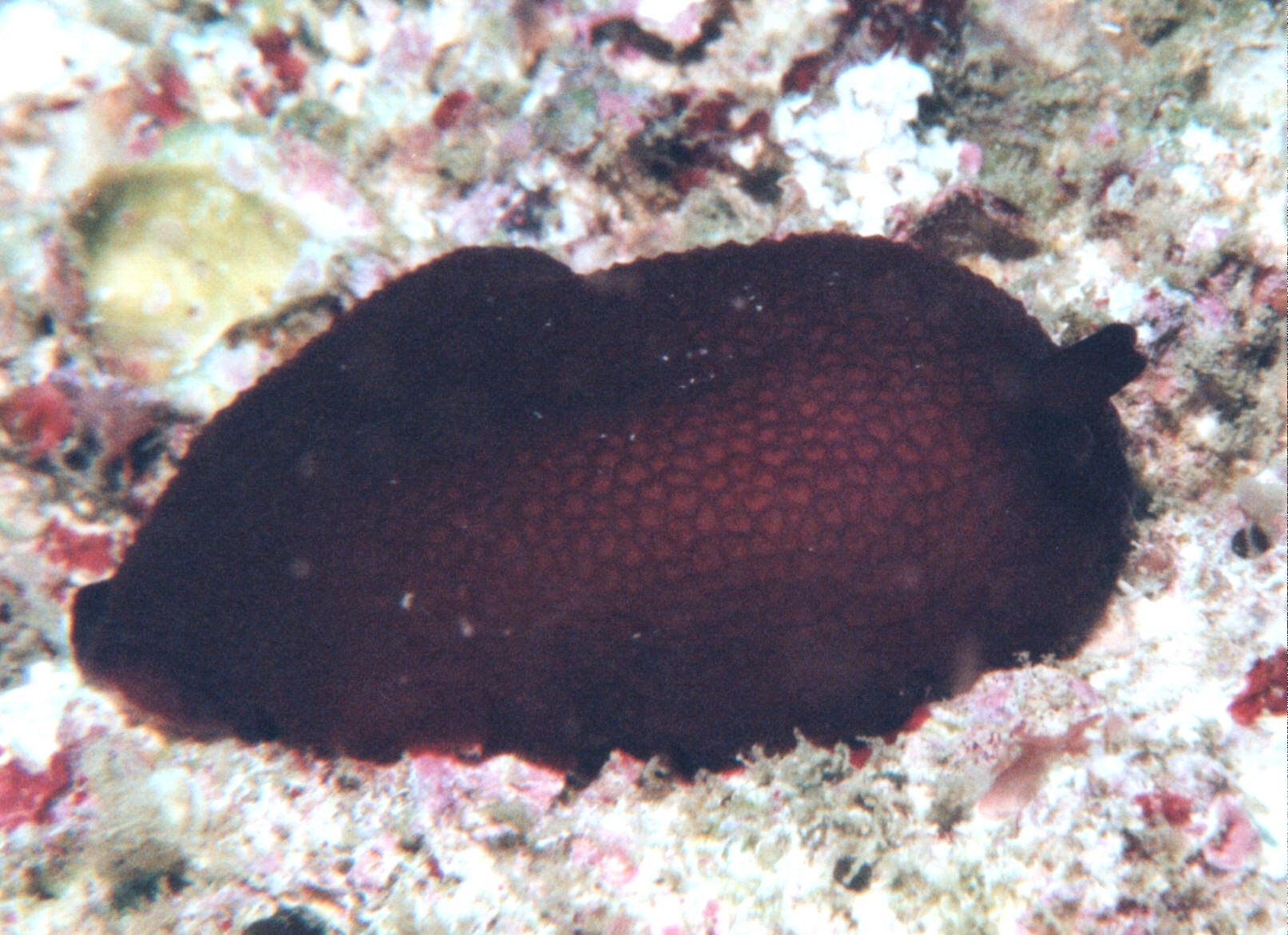 体長4cmほどの個体。底に落ちていた死サンゴのかけらの裏から見つかりました。当初ウミウシガイドブックを見て、伊豆編に載ってる 「カメノコフシエラガイ Pleurobranchus hirasei」と、慶良間編に載ってる「ベッコウフシエラガイ Pleurobranchus peroni」のどちらだろうと散々 悩んだのですが、ネットで調べた結果このふたつはシノニム(同種異名)で、現在は「カメノコフシエラガイ Pleurobranchus peroni」となって おり、和名ベッコウフシエラガイはよく似た別の種に当てられていることが判りました。学名と和名の関係は本当に複雑です。 2003. 2. 9. 「ロックガーデン」ポイントにて |