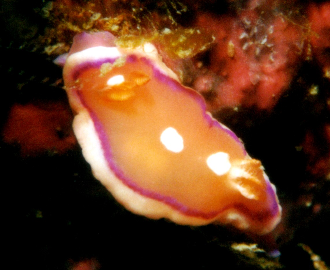 体長25mmほどの個体。アラリウミウシによく似ていますが、体の真中の白い部分が二次鰓の手前までで止まる、
