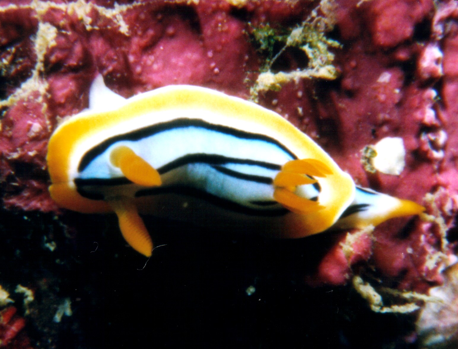 体長1cmほどの個体。このような Chromodoris属のウミウシはこちらではあまり見られないし、よく似た種類が多い上に 体長からまだ幼体と思われ、ピッタリのものがありません。ウミウシ好きの方の掲示板に投稿しアドバイスを頂いた結果、 背面のラインがはっきりしていることや触角の色のつき方、体のふちの白い部分などからこれだろうということになりました。 当初僕もいろいろ悩んだ結果シライトウミウシではないかと思ったのですが、背面のラインの具合が少し違うようです。 なかなか難しいですね。 2003. 11. 8 「水島」ポイントにて |