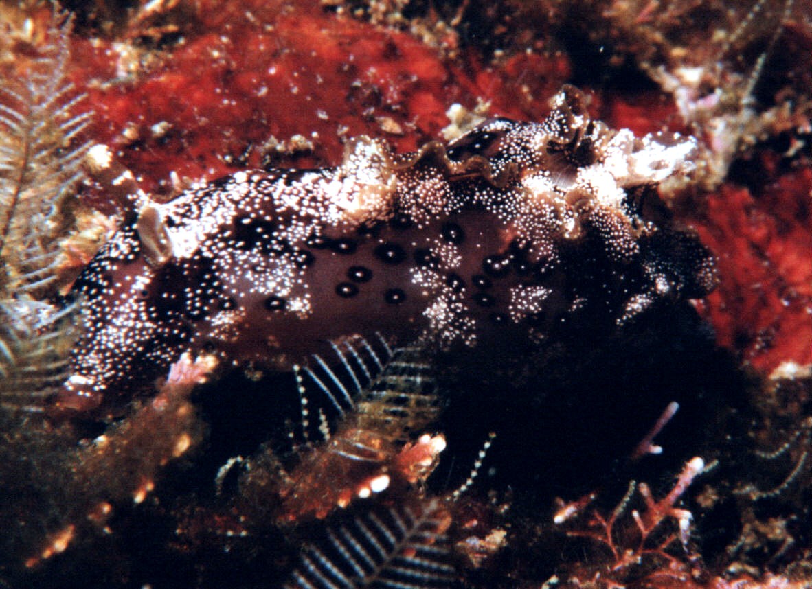 体長5cmほどの個体です。アメフラシの仲間は、名前を判断するのに苦労することがあります。それは色彩変異の幅が広い種類が 多い為ですが、これも名前とはまるで違う色をしています。眼紋がありジャノメアメフラシのように網目状のラインがない、白い細点が 散在するというウミウシガイドブック慶良間編の記述と、ラドマン先生のサイトにこれとよく似た体色の個体がありましたので、これと同定 しました。これはジャノメアメフラシと違って、ちょっと指で触っただけで、紫色の汁を3回も噴出しました。そこまでやらなくても…。 2003. 1. 13. 「バンドウの根」ポイントにて |