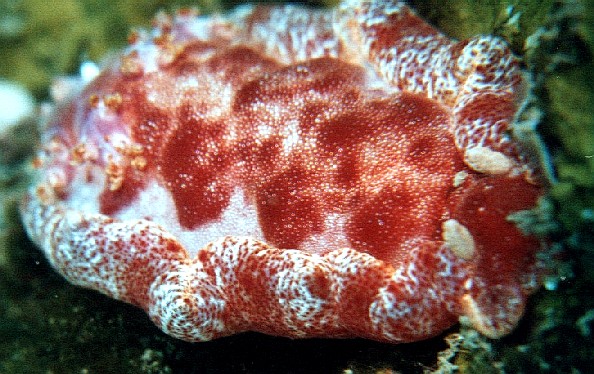 体長10センチほどの幼成体といったところでしょうか。写真では鮮やかな赤色ですが、肉眼では薄茶色に見え、ガイドの人が見つけて 教えてくれて、写真の撮りやすい方向に体を向けようと向きを変えて目をそらしたら、一瞬見失ってしまったくらい回りに同化してました。 一緒に潜った人は、端の丸まってる部分を何とか広げて写真を撮ろうとしたらしいですが、嫌がってすぐにまた丸めてしまったようです。 またそのうち、スパニッシュダンサーの名前の如く、華麗に泳いでる姿を目撃できるかもしれません。 2002.1.13. 「千尋の東」ポイントにて |