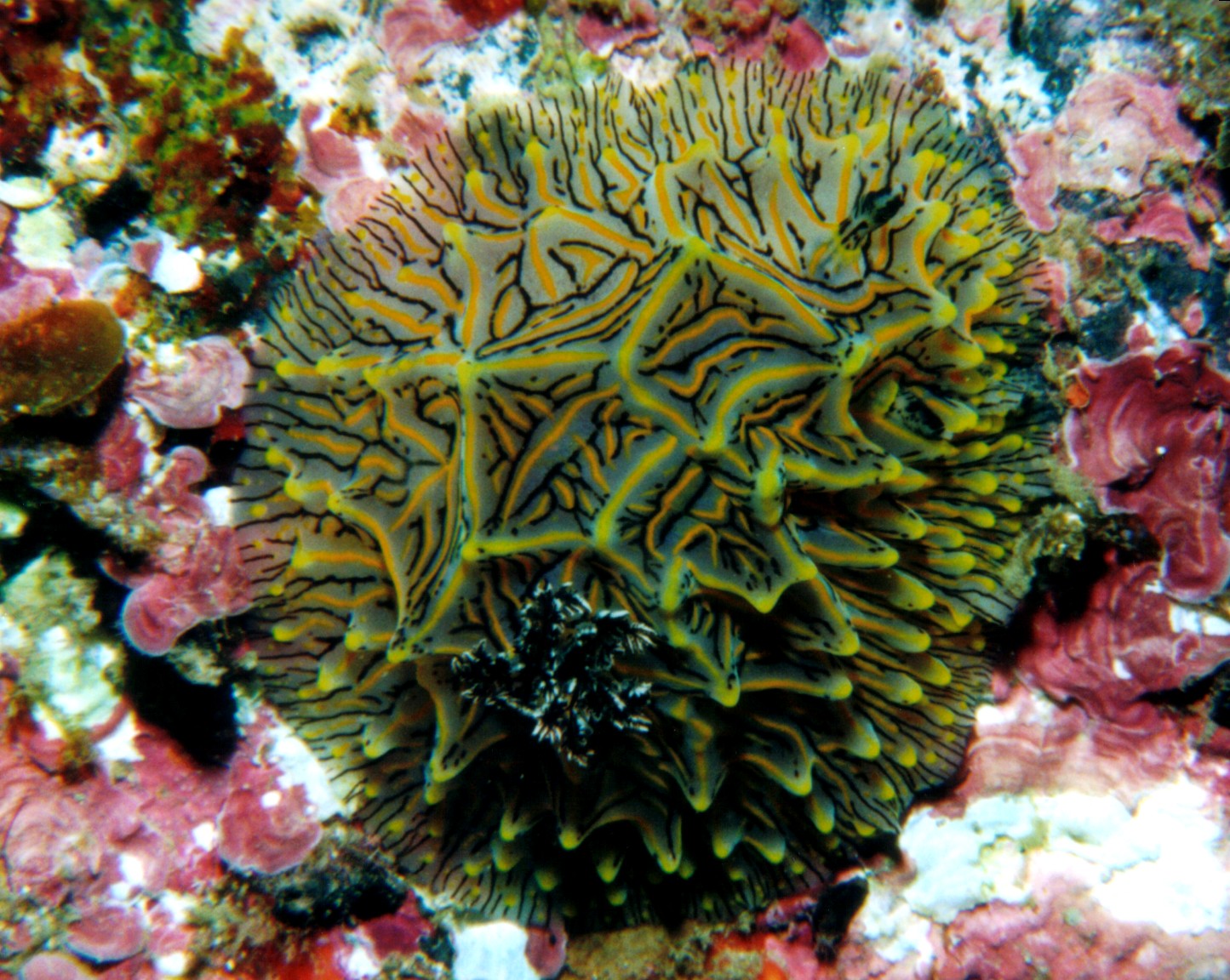 体長5cmほどの個体です。以前こちらでも目撃例はあったのですが、ようやく写真に収めることができました。 ウミウシガイドブックによると、二次鰓に黒い点があるのが特徴とされていますが、ラドマン先生のサイトにこの ような点がはっきりしないものもあり、基本となる黄色く太い線の間に黒と黄色の細線が入るパターンからこれと しました。この属はこちらでは初めてなのですが、この属で他の種もいても不思議ではないものもいますので、 これからまだ見つかる可能性はあると思います。 2003. 10. 30 「水島」ポイントにて |
