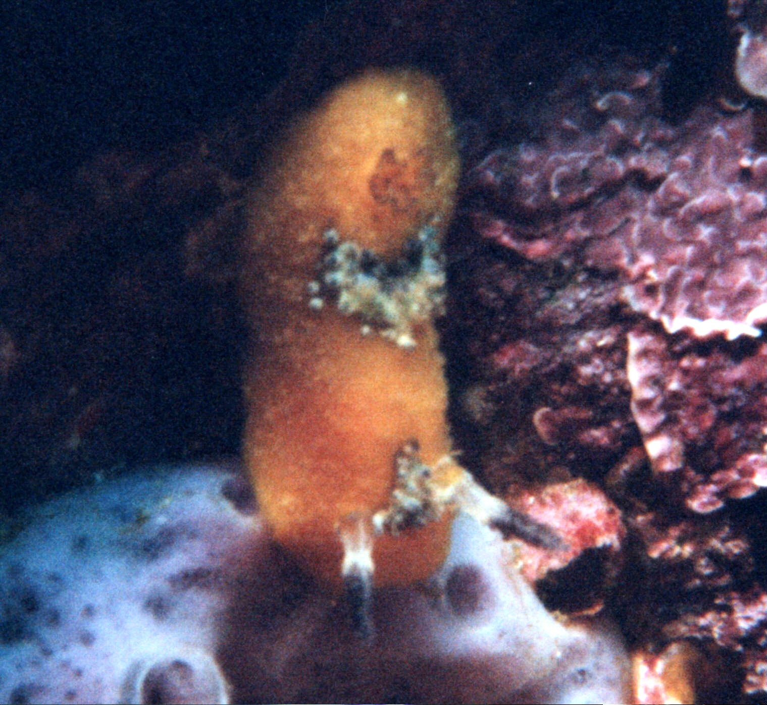体長15mmほどの個体です。名前や姿形からも何の変哲もないウミウシに見えますが、さにあらず。ウミウシガイドブックを見ても 似ているようなのはいるのですが、ズバリがみつからず、ネットでもいろいろ探してもなかなかみつからず、ようやく沖縄在住のボー ランド先生のサイトでよく似ているのを見つけました。ただ、体色や触角の色が少し違うので、思い切ってかねがね勉強の為に見 ていたウミウシフリークが集まるサイトに投稿してみたところ、これだということがはっきりしました。相模湾産後鰓類図譜には載って いるらしく、その記述を引用して説明していただきよく理解できました。やはりここは勉強になります。 2003. 1. 13. 「バンドウの根」ポイントにて 当初ヒオドシウミウシ Halgerda rubicunda としていたものですが、例のウミウシに詳しい人が集まる掲示板で、なんと 小野篤司さんからのご指摘をいただき、サンカクウミウシ Siraius immonda と訂正します。 2003. 1. 19. 再訂正です。和名サンカクウミウシは変わりませんが、学名を Siraius nucleola と変更します。詳しく書きますと長くなります ので割愛しますが、現在の最新の学名としてはこうなるそうです。もう一つ、前回の訂正で小野篤司さんからご指摘をいただいた と書きましたが、私の勘違いで、別の方でした。両ご本人がこれをご覧になることはまずないとは思いますが、ご本人はもちろん その他の方にも混乱を引き起こしたことをお詫び申し上げます。 2003. 1. 24. |