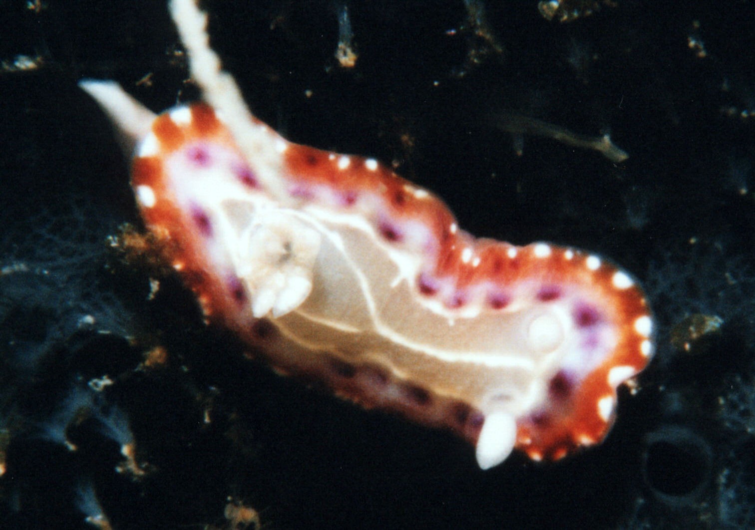 体長15mmほどのまだ小さな個体です。以前見たときはカメラトラブルで、せっかく初めて見たにもかかわらず 全く何も写ってなかったのでショックを受けましたが、再会できて思わずガッツポーズでした。ただ、多少うねりの ある壁にいたので、ピントも甘くなったし上のほうにヒドラか何かが写り込んでしまって少し残念です。全体的には 赤系統の色合いなのですが、それが微妙にバランス配合され、それに背面の白いラインと触角と二次鰓の白さが うまくマッチしててとてもきれいです。 2003. 3. 9. 「千尋の中」ポイントにて |