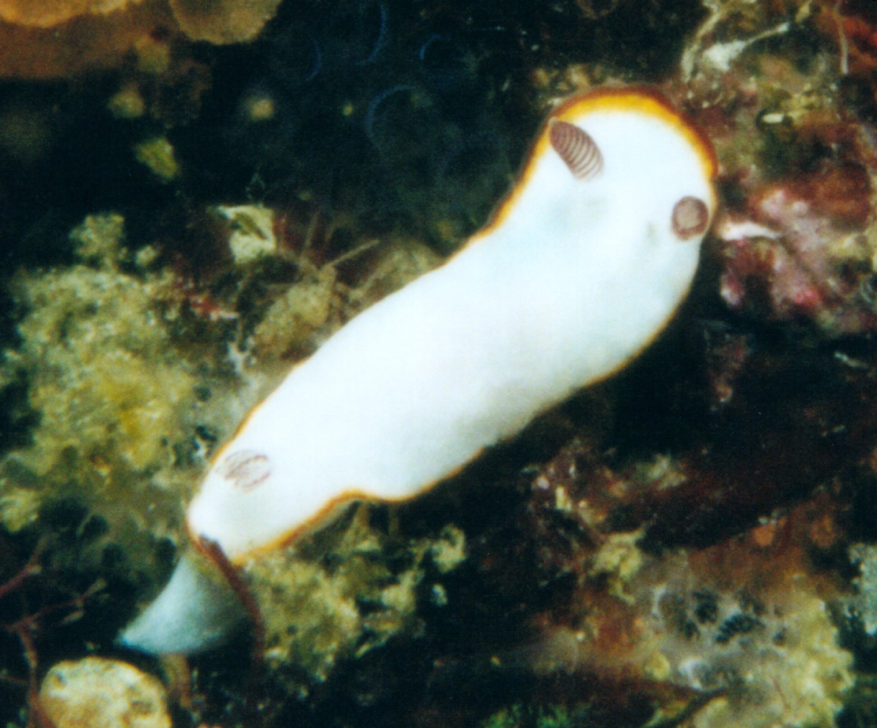 体長7mmほどの個体。実際見た時はシラユキウミウシかとも思ったのですが、体にそれほど丸みも無いし、