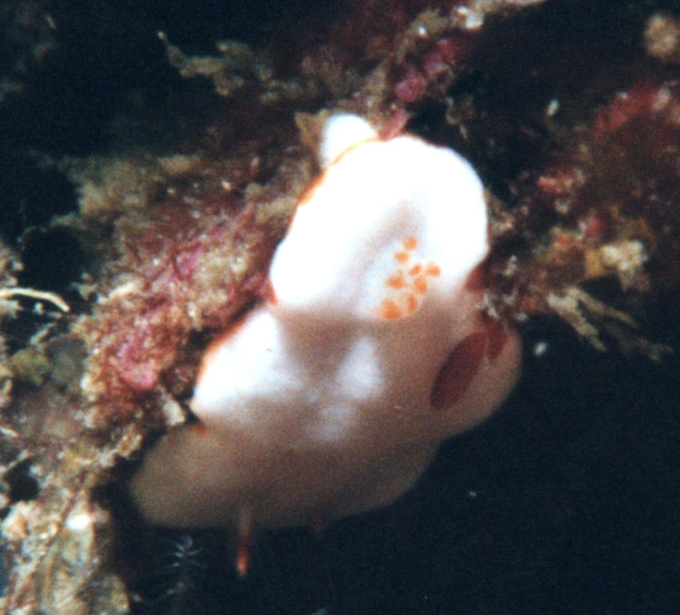体長1cmほどの個体。頭を窪みに突っ込んでいて全身が見れないのが残念です。最近良く見る「シロウサギウミウシ」に