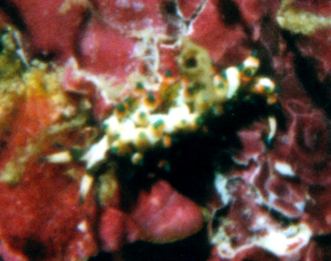 体長7mmほどの個体。逆光でしかもうねりがあり、ファインダーを覗いてもどこにいるのかさっぱり分からない状況で 2カットは撮れたうちの1枚です。ボケ写真になってしまいましたが何とか特徴は分かるくらいになりました。最近ネットで 時々見かけたりウミウシガイドブックに載ってるものとは少し違うように思えたのですが、ケラマの小野さんのサイトに掲載 されているものとほぼ同じでした。これも是非もう一度撮りなおしたいと思いますが、はたしてまた会えるかどうか。 2003. 10. 22 「バンドウの根」ポイントにて |
