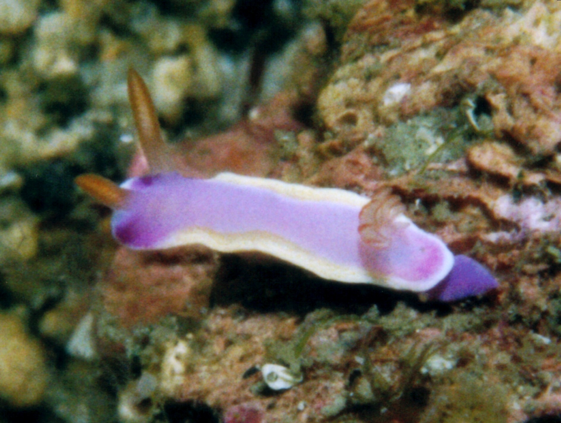 体長15mmほどの個体。肉眼で見たときはシンデレラウミウシかと思ったのですが、写真で見ると二次鰓の形も違うし 体のふちの白い帯も体を取り囲んでいない。触角も体の大きさからすると大きすぎる。と言うことで調べた結果、まず 始めにラベンダーウミウシと言うものを見つけたのですが、これも周囲の白い縁取りが体を1周してるので違う。そして ラドマン先生のページでようやくこれを見つけました。ただ、そこに載ってる沖縄のボーランド先生の写真があまりよく なく、100%これであるといいきれない部分もあるので cf. をつけました。 2003. 8. 3 「ジャングルジム」ポイントにて |