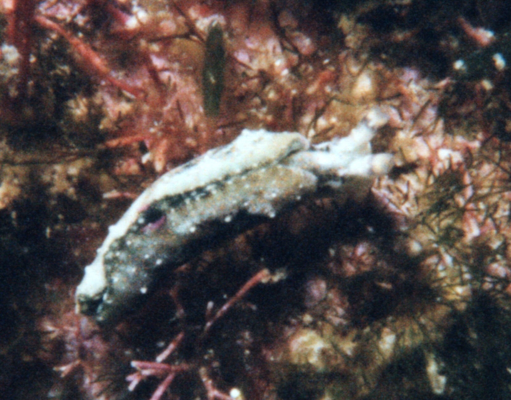 黒いのがわずかに確認でき、黄色い小さな点がある、白いかすれたような模様があることなどから、ウミウシガイドブック慶良