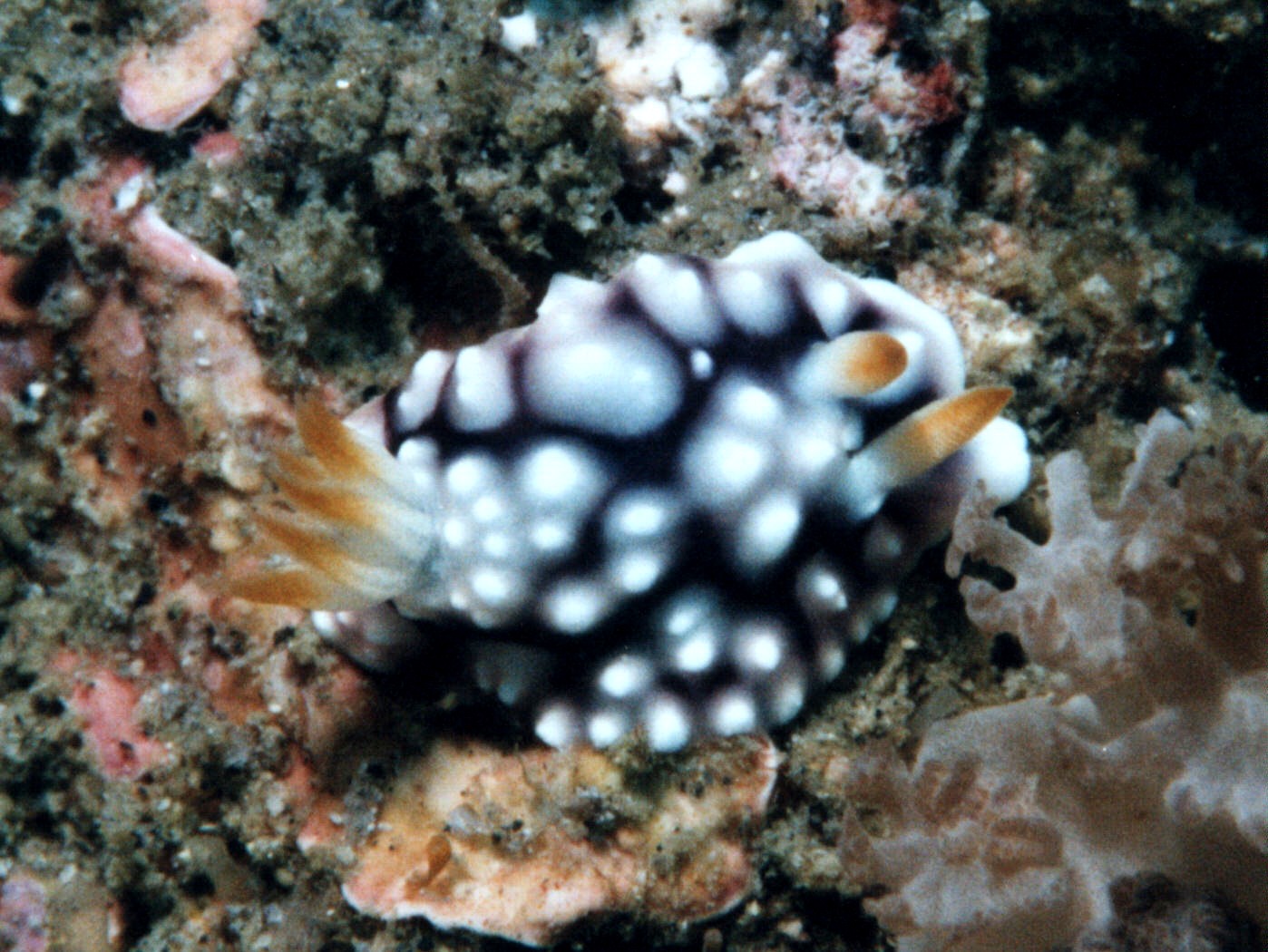 体長3cmほどの個体です。今までに見たことのあるキカモヨウウミウシは、触角と二次鰓の色が緑色だったのですが、