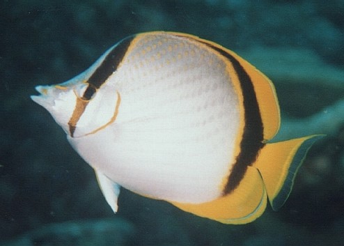 あまり見慣れないチョウチョウウオだと思って撮って調べたらこれでした。図鑑で見ると、他の魚とは逆に、
