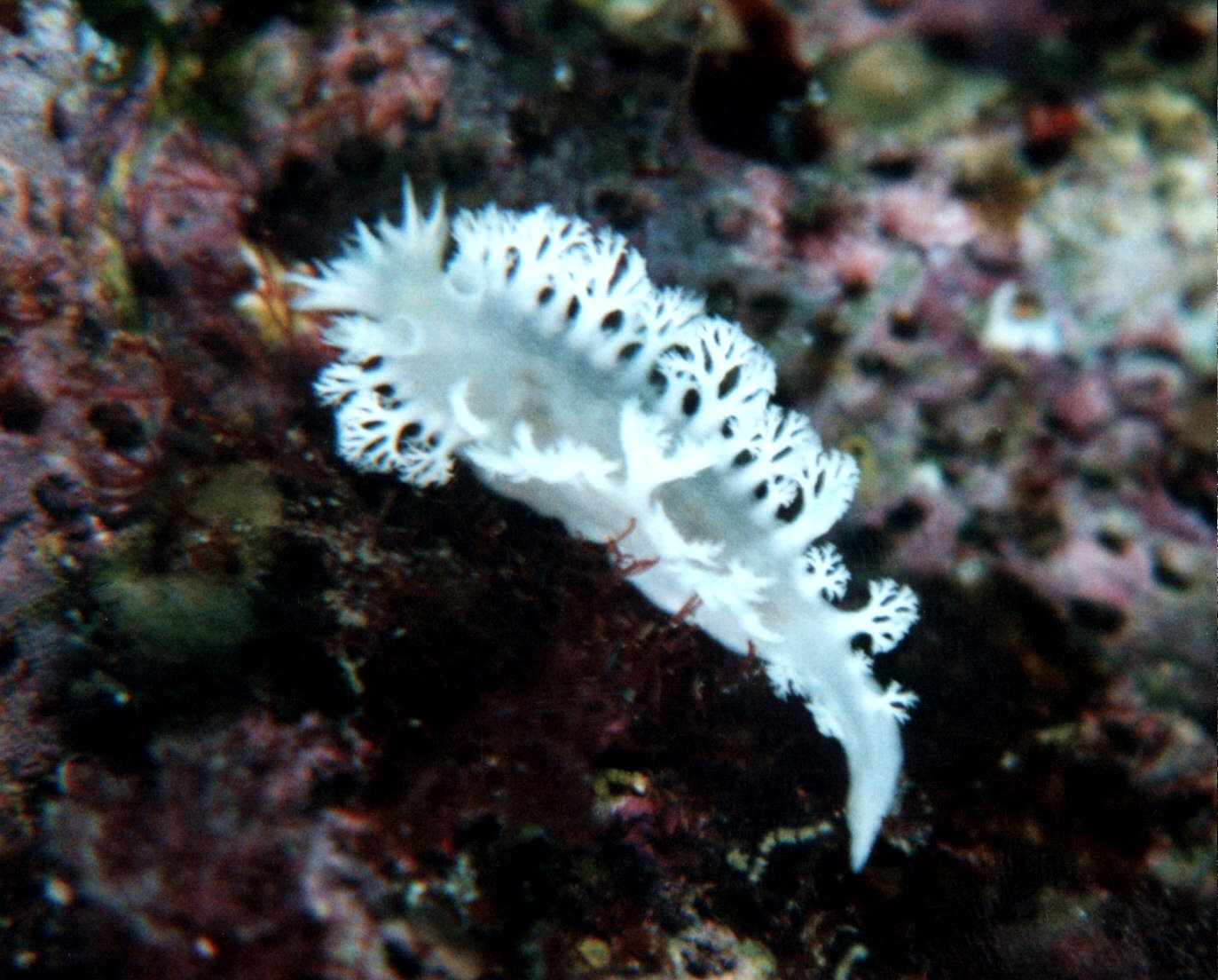 その体の白さと背中の房の繊細さから、非常に撮りにくいウミウシで、三崎浦でもちょくちょく見かけるのですが、 なかなかいい写真が撮れません。これもそれほどいいものではありませんが、このきれいな体形は分かっていた だけると思います。体長2cmほどと、若干大きかったのも幸いでした。これは、ユビノウトサカというソフトコーラル を餌にしているので、それがあるところを探せば見つかる可能性もありますが、西海ではユビノウトサカがあるとこ ろは、そんなに多くないと思います。 2002. 4. 14. 「断層」ポイントにて |
