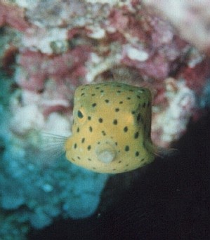 黄色に黒点のピンポン玉です。でも水色の斑点も見えるので、「ミナミハコフグ」ではなく、