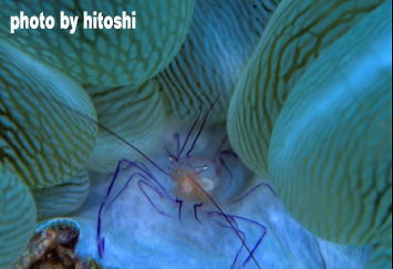 宮古島のデベソTで撮影した。アカヒゲカクレエビが四股を踏んでいるように撮影できた。はさみが切れているのが、ちょっと失敗である。水玉サンゴを見つけたら、よく探すとたいてい住んでいる。