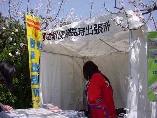 あんずの里内に出張してきた更埴郵便局。記念切手や絵葉書を売っていました。あんず関連の記念切手は見られませんでしたが、近くにある古墳にちなんだ切手や長野県関連の絵葉書などがありました。