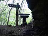 鎖場を抜けると、大きな岩が横たわっているポイントに遭遇します。 この岩はよくも落っこちないもんだと感心します。すぐそばに小さな祠があるので、そこの神様が守っているのでしょうか。 とにかくデカイです。押しても無駄です。びくともしません。
