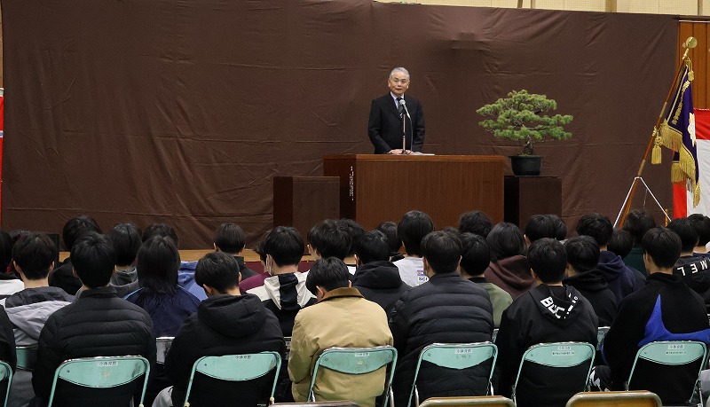 卒業式前日の3月2日(月)に、同窓会入会式を行いました。卒業生が4月から松工同窓会の正会員となります。入会にあたり、山地副会長よりお言葉をいただきました。これからも松工のOB、OGとして在校生に支援をしていただきたいと思います。(R8.3.2)